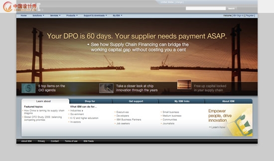 另外我們還可以看到IBM這次新的設(shè)計(jì)比原來的設(shè)計(jì)更有立體感,這就是我上面所說的元素層次。這種層次感拉開了瀏覽者的視覺深度,使得我們的網(wǎng)頁不再平面。雖然也不是3D的效果,但是我相信2D的效果必然會(huì)成為網(wǎng)頁設(shè)計(jì)的一個(gè)新的趨勢(shì)。通過2D模擬出視覺立體感,會(huì)使得網(wǎng)頁設(shè)計(jì)更有張力,內(nèi)容也更為豐富。