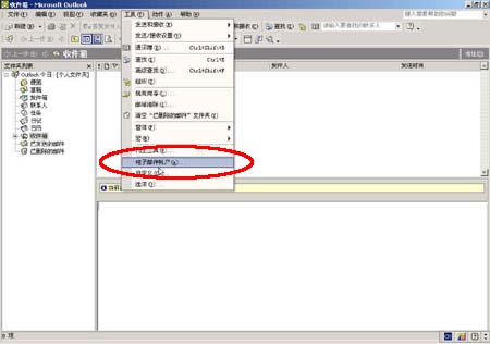 2.從菜單中選擇"工具/帳號(hào)"菜單項(xiàng),打開(kāi)"電子郵件帳號(hào)"窗口;