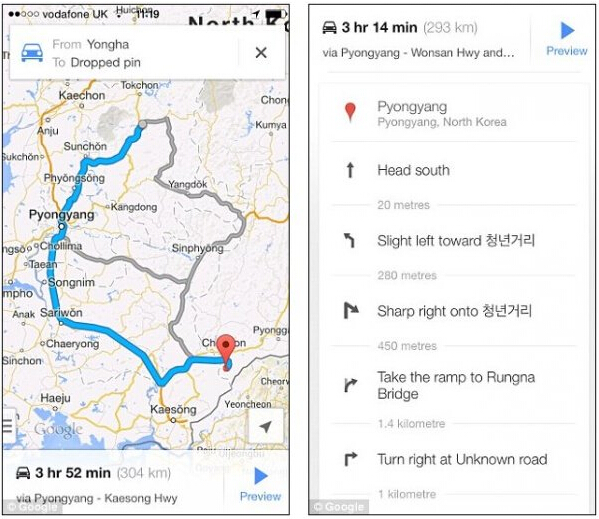 雖然谷歌地圖在朝鮮也能顯示火車和地鐵線路,但不能像其他地區(qū)一樣提供時(shí)間信息。因?yàn)槌r限制了許多重要信息,這也許是因?yàn)楣雀柙陧n國首爾有分部而朝鮮沒有,這違反了朝鮮的法律——因此不提供重要信息給谷歌。