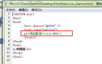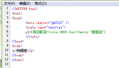 <!DOCTYPE html> <html> <head> <meta charset="gb2312" /> <style type="text/css"> p{/*三漢字*/color:#f00;} </style> </head> <body> <p>測(cè)試</p> </body> </html>