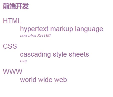 1 <!DOCTYPE html> 2 <html lang="en"> 3 <head> 4 <meta charset="UTF-8"> 5 <title>筆記</title> 6 <style> 7 body{color:#969;} 8 h1{font-size: 15px;} 9 dd+dt{ 10 margin-top: 10px; 11 } 12 dd+dd{ 13 font-style: italic; 14 font-size: 10px; 15 } 16 </style> 17 </head> 18 <body> 19 <h1>前端開(kāi)發(fā)</h1> 20 <dl> 21 <dt>HTML</dt> 22 <dd>hypertext markup language</dd> 23 <dd>see also:XHTML</dd> 24 25 <dt>CSS</dt> 26 <dd>cascading style sheets</dd> 27 <dd>css</dd> 28 29 <dt>WWW</dt> 30 <dd>world wide web</dd> 31 </dl> 32 </body> 33 </html>